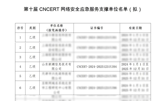 为加强网络安全应急技术协作体系建设,提升重大突发网络安全事件应对和保障能力,根据申报单位综合能力及支撑国家计算机网络应急技术处理协调中心网络安全工作情况,经自主申报、形式审核、专家评审、研究确认等环节,山东新潮信息技术有限公司再次作为山东省唯一入选单位,被遴选为第十届CNCERT网络安全应急服务支撑单位(全国共59家)。